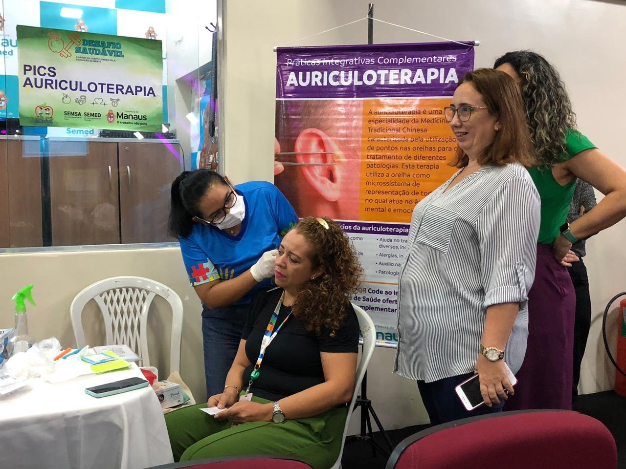 Servidores da Secretaria Municipal de Educação (Semed) participaram, nesta segunda-feira, 27/4, da 4ª edição do projeto Desafio Saudável, realizada no auditório e no hall da sede da secretaria, no bairro Parque 10 de Novembro, zona Centro-Sul de Manaus. Coordenado pela Divisão de Apoio à Gestão Escolar (Dage) e pela Gerência de Atividades Complementares e Programas Especiais (Gacpe), em parceria com a Semsa, o evento ofereceu palestras, aulas de pilates solo, aulas de ritmo e dança, gincana educativa, além de serviços de saúde.