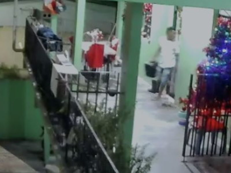 De acordo com as imagens, o suspeito aparece entrando no imóvel, dirigindo-se diretamente ao aparelho de som e deixando o local com o objeto nas mãos, demonstrando tranquilidade durante todo o percurso.