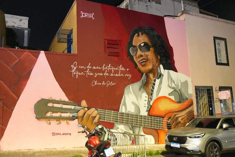 Área externa (rua Barroso) – mural “Raízes Amazônicas”, do grafiteiro Cria, em homenagem ao cantor e compositor Chico da Silva, reconhecido como patrimônio cultural da Amazônia.