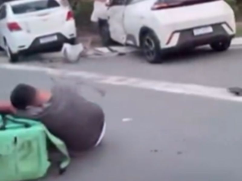 De acordo com testemunhas, o impacto foi forte e deixou a moto completamente destruída. Imagens gravadas por pessoas que passavam pelo local mostram o entregador caído no chão sendo atendido por populares até a chegada do socorro.